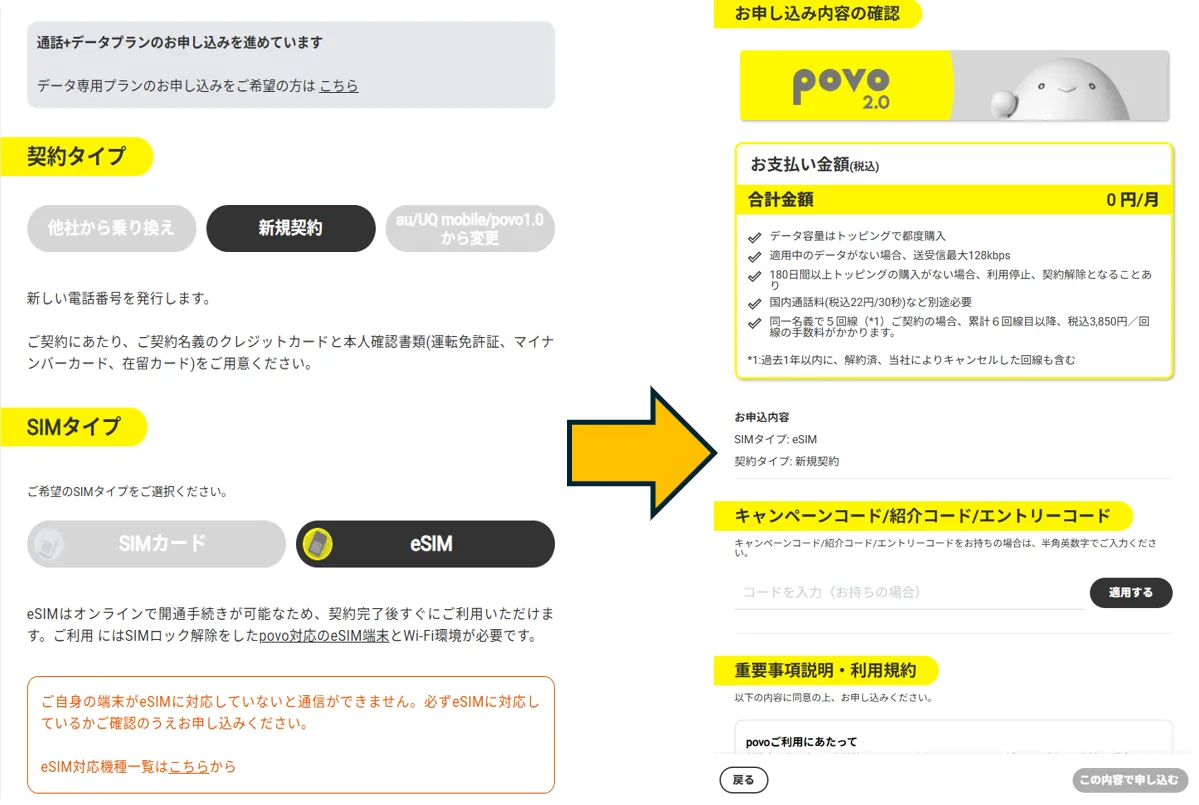 実際の申し込みは、povo公式サイトの SIM / eSIM開通のお手続き を見ながら進めるのが一番確実です。